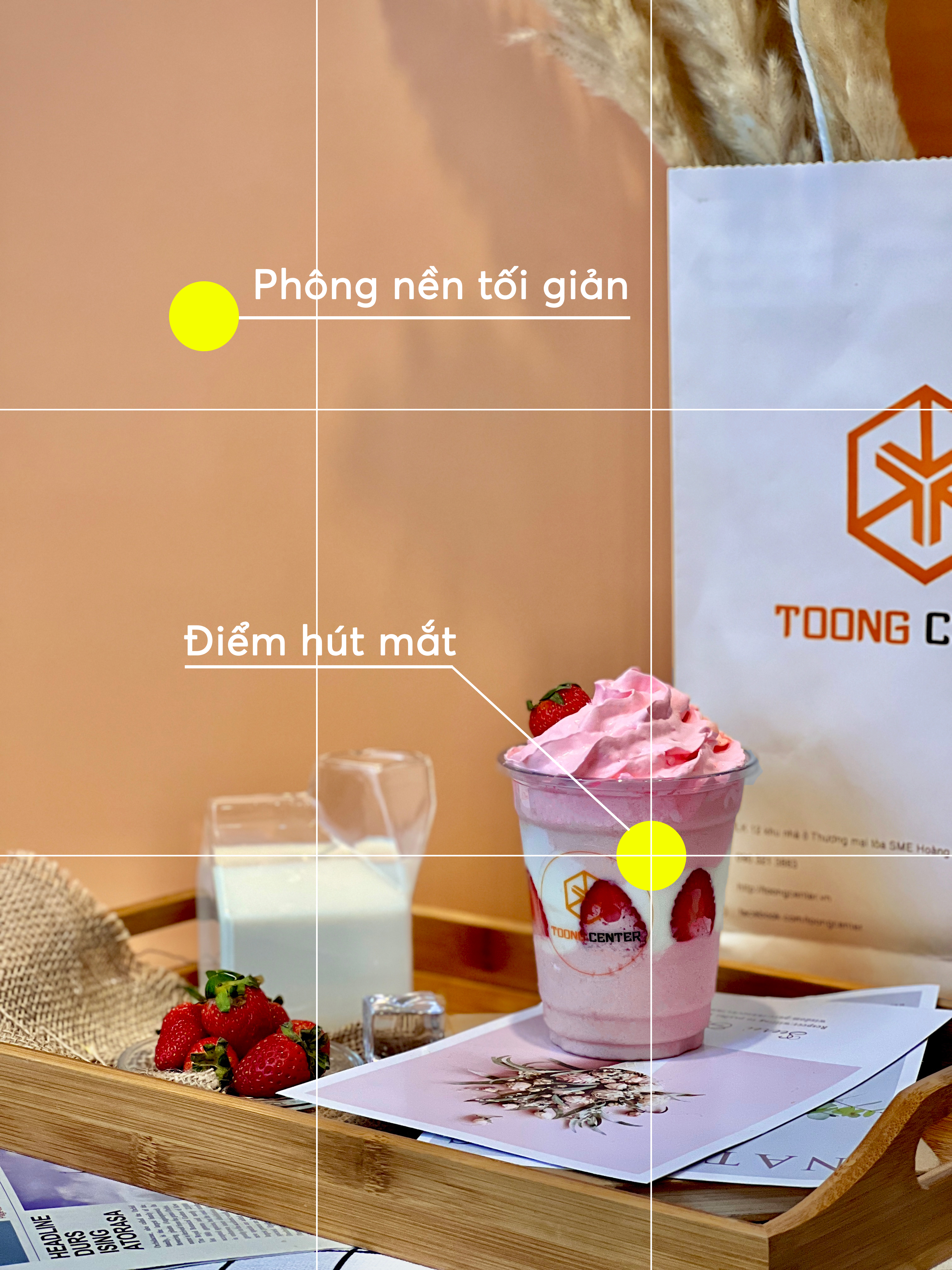 Để làm nổi bật đồ uống của mình, bạn nên lựa chọn phông nền phía sau đơn giản, không màu mè, phức tạp. Bên cạnh đó, vấn đề tỉ lệ khung hình là vô cùng quan trọng. Bạn có thể sử dụng khung lưới camera để chia màn hình, sau đó áp dụng tỉ lệ vàng ⅓ để đồ uống của bạn rơi vào điểm thu hút nhất trên bức ảnh.