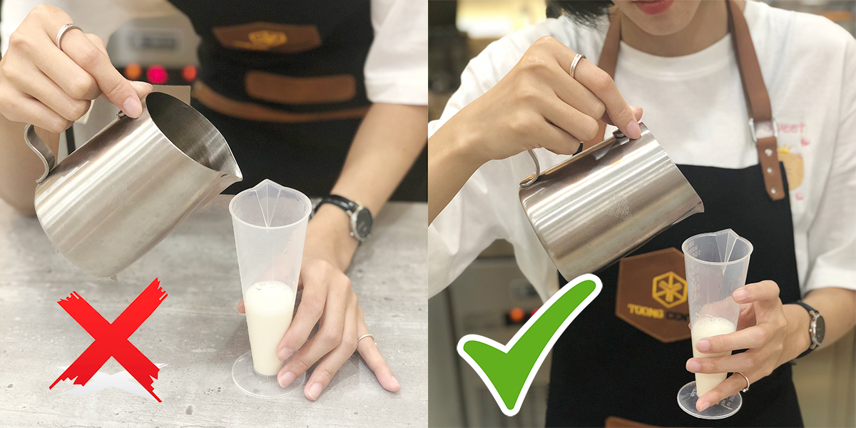 Việc cầm jigger (dụng cụ đong đếm) ngang tầm mắt sẽ giúp việc đong đếm chuẩn xác hơn do góc nhìn từ mắt vào vạch đong là phương nằm ngang. Việc đặt jigger xuống mặt bar khiến người pha chế thiếu tính chuyên nghiệp, nhất là lâu dài sẽ khiến bạn đau lưng, gặp vấn đề về sức khỏe đó nhé.